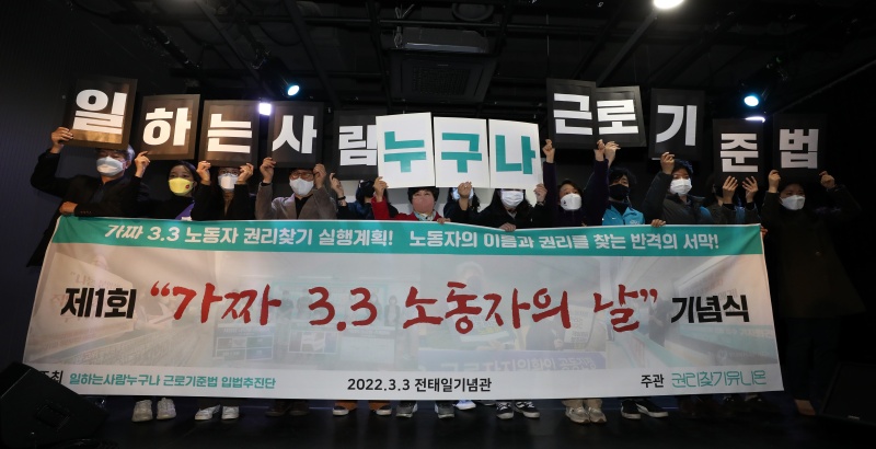 권리찾기유니온 등 ‘일하는사람누구나 근로기준법 입법추진단’은 이날 서울 종로구 아름다운청년전태일기념관에서 ‘제1회 가짜 3.3 노동자의 날’ 기념식을 진행했다.