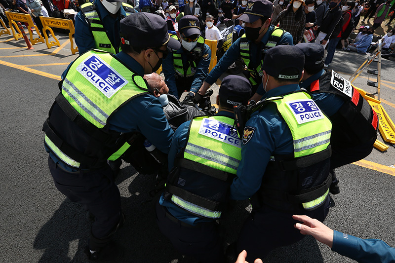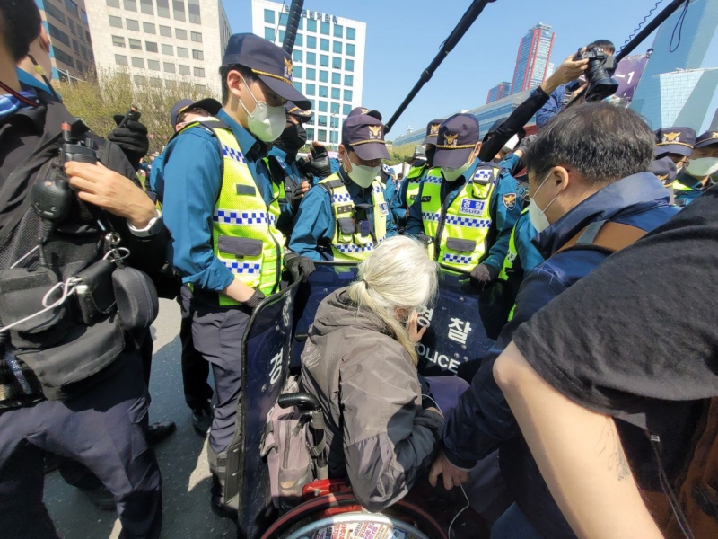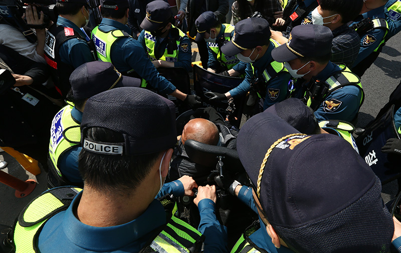 20일 오후 서울 영등포구 여의도 국회 인근에서 장애인차별철폐의 날 '420 장애인차별철폐 투쟁결의대회'에서 전국장애인차별철폐연대(전장연) 회원이 경찰과 대치 하고 있다. 2022.04.20 ⓒ민중의소리