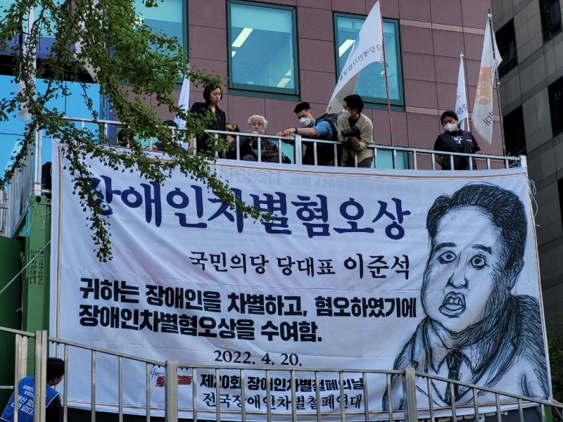 제21회 ‘장애인차별철폐의 날’인 20일 불명예의 주인공은 이준석 대표였다. 전국장애인차별철폐연대(전장연) 박경석 상임대표는 서울 여의도 국회 인근 ‘장애인권리보장법 등 촉구’ 농성장 꼭대기에 올라서서 이 대표에게 장애인차별혐오상을 수여하고 “즉각 사과하라”며 목소리 높였다.