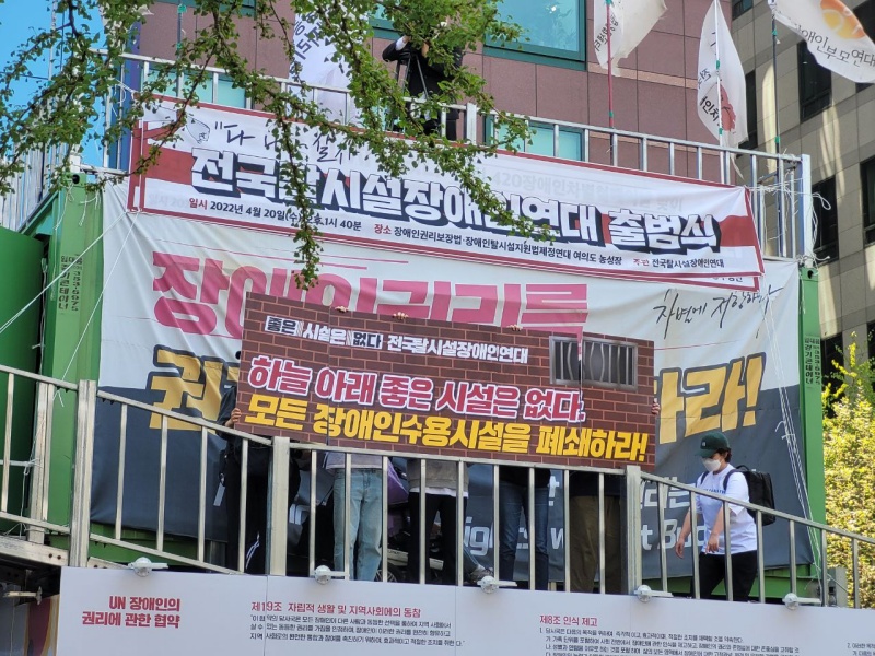농성장에 올라선 전국탈시설연대 ⓒ민중의소리