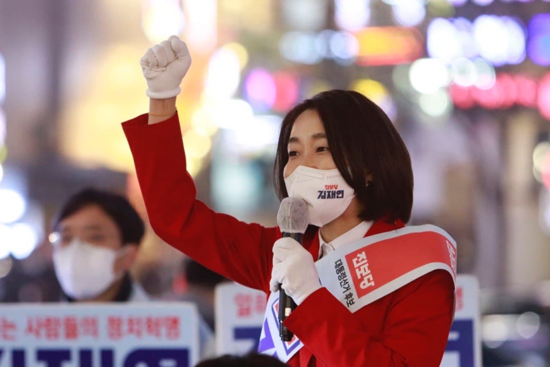 지난 3월 8일 당시 김재연 진보당 대선후보가 공식선거운동 마지막 날 저녁 서울 강남역 10번 출구에서 유세를 하고 있는 모습. ⓒ진보당