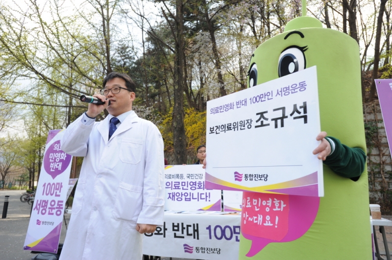 조규석 박사가 통합진보당 보건의료위원장이던 지난 2013년 의료민영화 저지 100만 인 서명운동에 나선 모습 ⓒ진보정치