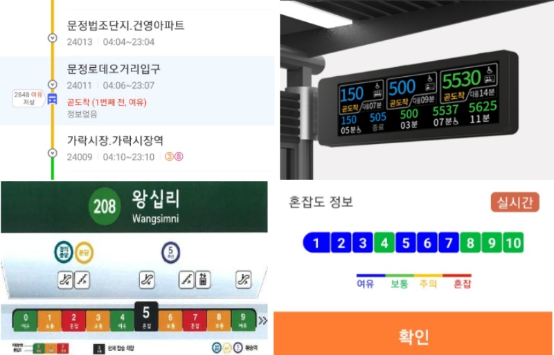 버스는 정류장 버스정보안내단말기(BIT)에서 실시간 도착과 차량 혼잡도를 제공한다. 버스 차내 혼잡도는 여유, 보통, 혼잡 3단계로 나눠 안내한다. ‘여유’는 좌석에 앉을 수 있는 정도, ‘보통’은 입석 승객이 손잡이를 잡고 서 있을 수 있는 정도, ‘혼잡’은 입석 승객들 사이 통로에 승객이 있고 몸이 맞닿는 정도나 그 이상을 의미한다.