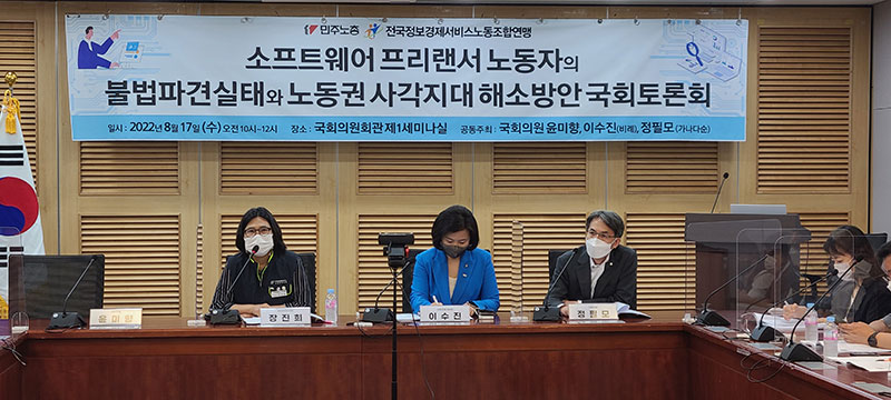 17일 국회의원회관에서 'SW프리랜서의 불법파견실태와 노동권 사각지대 해소 방안 토론회'가 진행되고 있다. ⓒ전국정보경제서비스노동조합연맹