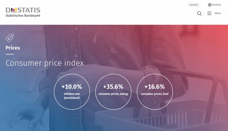 독일 연방 통계청 홈페이지에 소개된 8월 소비자물가지수(CPI), 물가 상승률 10%, 에너지 소비자물가 35.6% 상승, 식료품 소비자물가 16.6% 상승 등 높은 인플레이션이 눈에 띈다. ⓒ출처 : 독일 연방 통계청 홈페이지