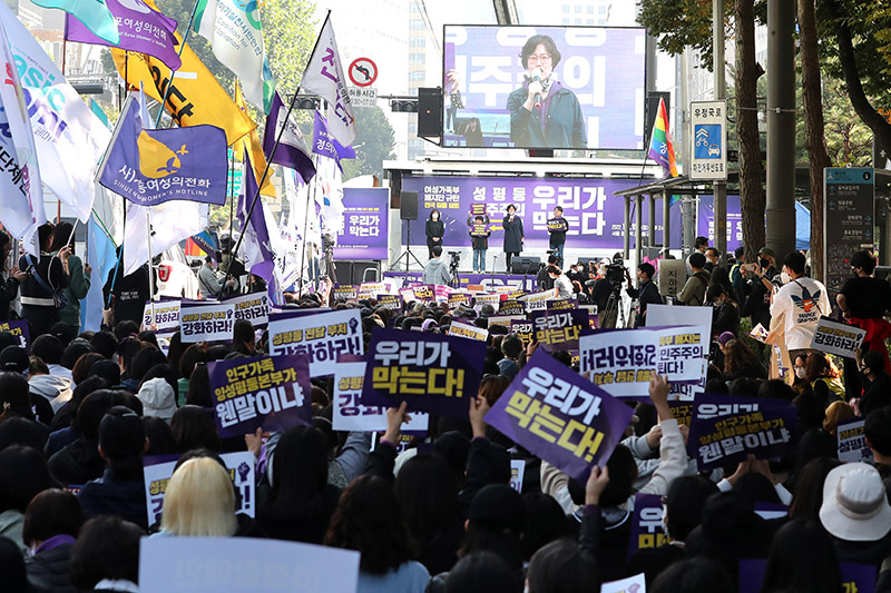 15일 오후 서울 종로구 종각역 사거리에서 열린 윤석열 정부의 '여성가족부 폐지안 규탄 전국 집중 집회: 성평등 민주주의 후퇴 우리가 막는다'에는 2,500여명(주최측 추산)의 시민들이 참여했다. 2022.10.15 ⓒ민중의소리