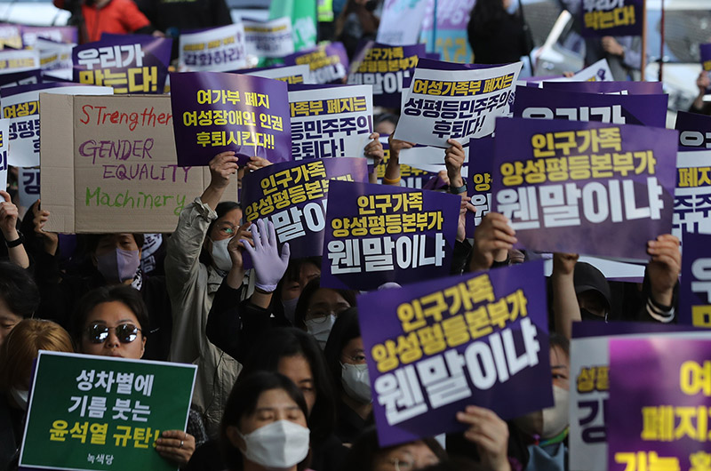 15일 서울 도심에선 윤석열 정부의 여성가족부 폐지 시도를 규탄하며 이를 저지하겠다는 다양한 연령대의 시민 2천5백여명(주최측 추산)이 모여 집회와 행진을 벌였다. 이들은 윤석열 정부의 행위가 '민주주의 후퇴' ,' 차별 강화' , '불평등 공고화', '반헌법적 조치'라고 강력하게 규탄했으며, 향후 정책 추진을 막기 위해 강력하게 행동할 것이라고 천명했다.
