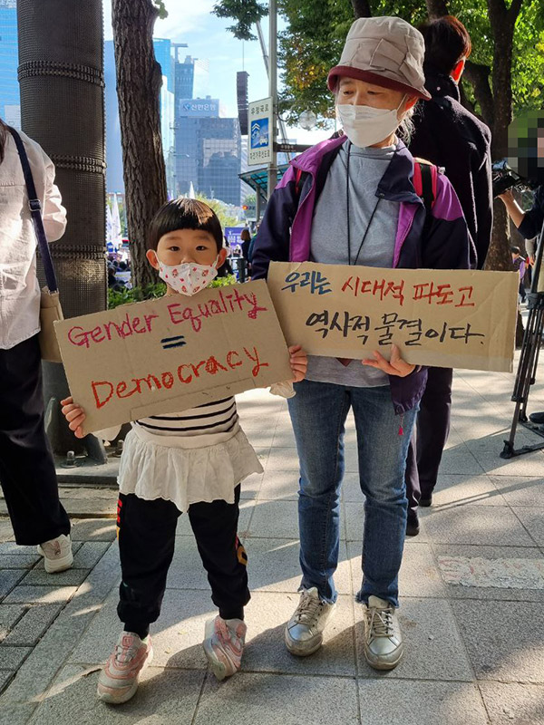 15일 오후 서울 종로구 종각역 네거리에서 윤석열 정부의 '여성가족부 폐지안 규탄 전국 집중 집회: 성평등 민주주의 후퇴 우리가 막는다'가 열렸다. 집회에 참석한 손녀와 할머니가 수제 피켓을 들고 미소를 짓고 있다. 2022.10.15 ⓒ민중의소리