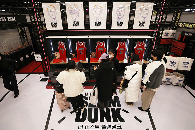슬램덩크 팬들이 지갑을 열자 유통업체들은 슬램덩크 마케팅에 나서고 있다. 영화 '더 퍼스트 슬램덩크' 수입사인 SMG홀딩스는 지난달 26일 서울 영등포구 여의도 더현대 서울에 팝업스토어를 열었다. 팝업스토어가 열린 13일간 누적 방문 고객은 18,000여 명에 이른다. 매출은 개점 5일 만에 5억원을 돌파한 것으로 알려졌다.