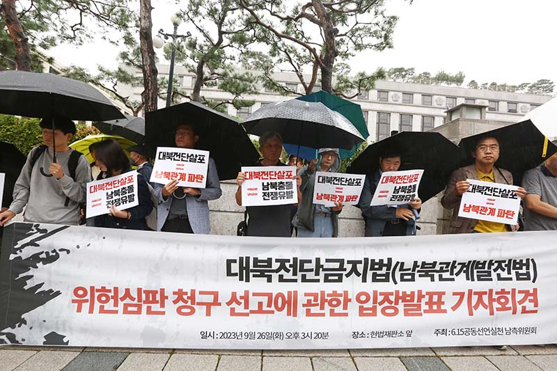 6.15공동선언실천 남측위원회 관계자들과 접경지역 주민들이 26일 서울 종로구 헌법재판소 앞에서 대북전단금지법 위헌 심판 선고에 관한 입장발표 기자회견에서 헌법재판소 선고를 규탄하고 있다. 2023.09.26 ⓒ민중의소리