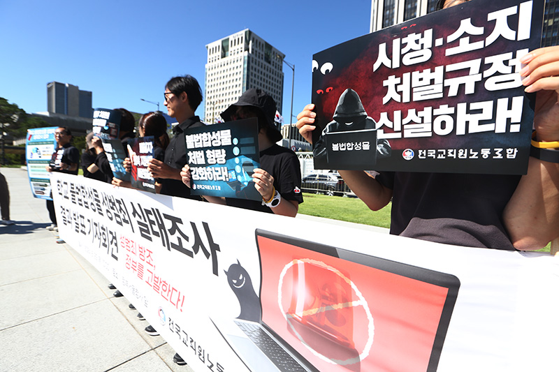 전희영 전국교직원조합(전교조) 위원장과 조합원들이 29일 서울 종로구 정부서울청사 앞에서 열린 학교 불법합성물(딥페이크) 성범죄 실태조사 결과 발표 기자회견에서 손피켓을 들고 있다. 2024.08.29 ⓒ민중의소리