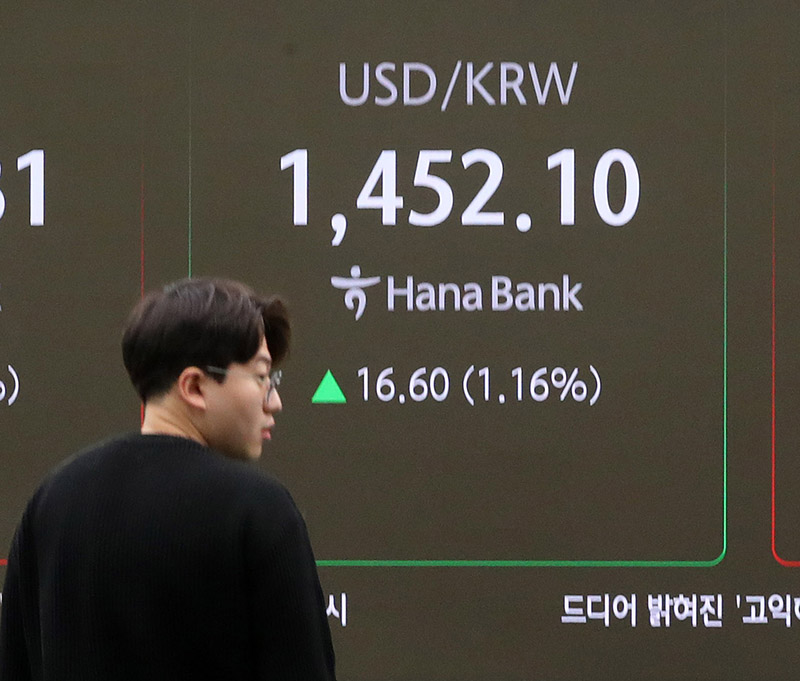 19일 오전 서울 중구 하나은행 딜링룸 전광판에 원·달러 환율이 전 거래일 주간거래 종가(1435.5원)보다 13.9원 오른 1453.0원에 출발한 모습이 표출되고 있다. ⓒ제공 : 뉴시스