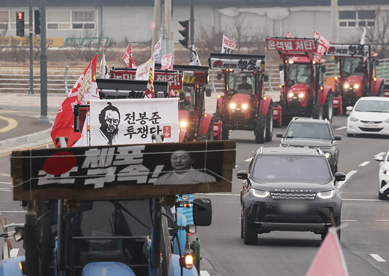 지난 20일 오후 경기 평택시 진위역 앞에서 전국농민회총연맹 전봉준투쟁단 농민들이 비상계엄령을 선포한 윤석열 대통령의 체포와 구속을 촉구하며 트랙터를 몰고 상경 시위를 벌이고 있다. 농민회는 16일 전남 무안과 17일 경북 고령에서 각각 출발하여 이날 수원에 도착, 21일 서울에 도착할 예정이다. ⓒ제공 : 뉴스1