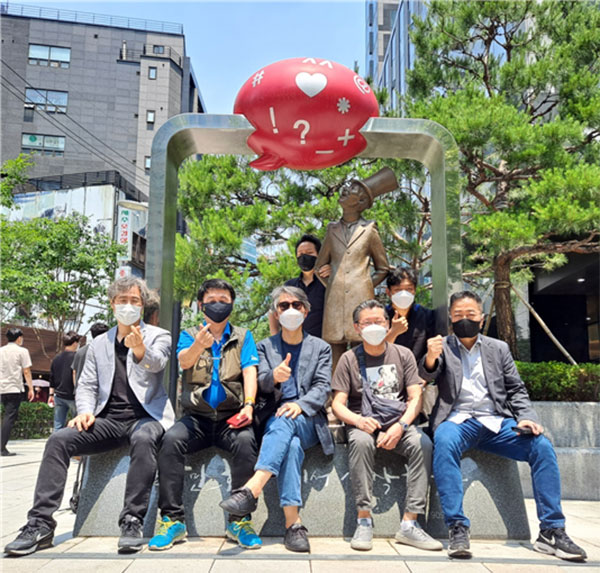 2일 전국시사만화협회 주최로 서울 종로구 소재 대한민보 옛터에서 112주년 시사만화의 날 기념식이 열렸다. 식을 마친 후 시사만화가들이 한국 최초의 시사만화를 그린 이도영 화백의 만평 입체조형물 앞에서 기념 촬영을 했다. 뒷줄 왼쪽부터, 최재용(YTN) 권범철(한겨레) 안종만(상지대) 이동수(마인드포스트) 최민(민중의소리) 유동수(경기일보) 김용민(경향신문). 2021.06.02 ⓒ사진 = 전국시사만화협회