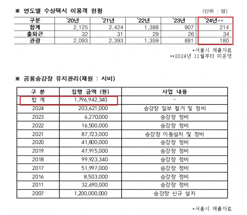 그간 서울시가 한강 수상택시 사업을 위해 쓴 예산은 17억 9,694만원에 달한다. 2007년 승강장 신규 설치를 위해 12억원을 투입했으며, 2011년과 2016년~2024년까지 승강장 정비 등으로 적게는 수백만원이, 많게는 수억원이 매년 투입됐다.