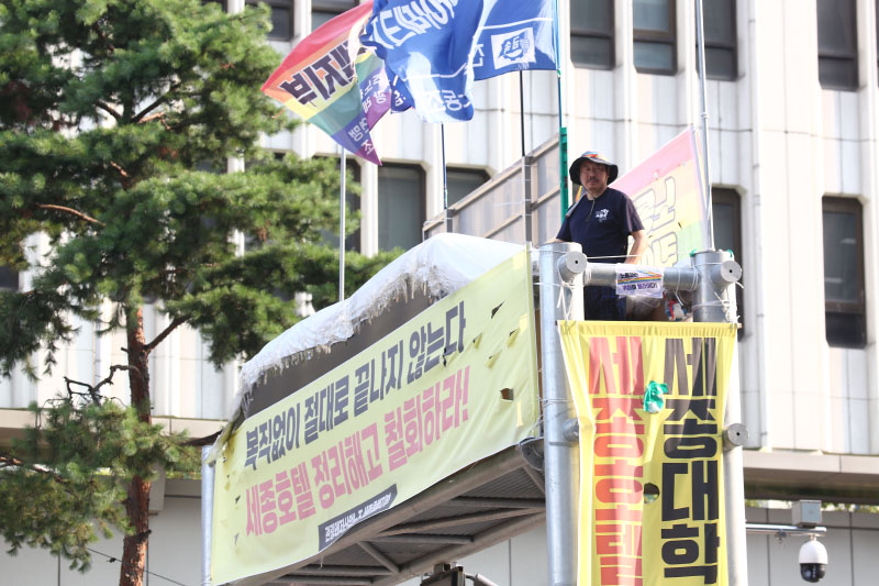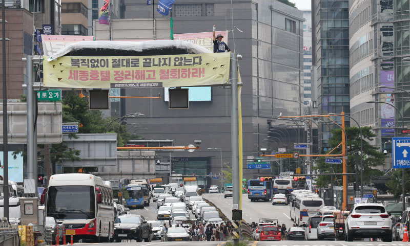 고진수 관광레저산업노조 세종호텔지부 지부장이 25일 서울 중구 세종호텔 앞 10미터 높이의 구조물에 올라 정리해고 철회를 촉구하며 고공농성을 하고 있다. 2025.07.25 ⓒ민중의소리