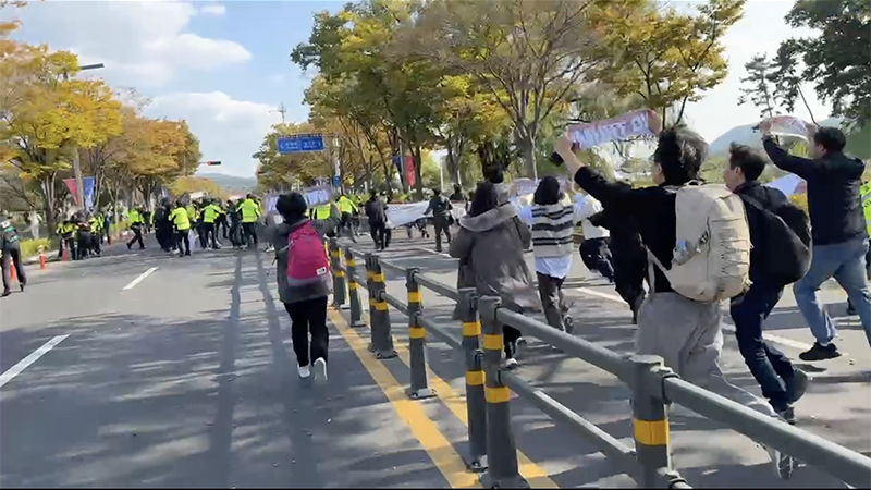 노동자와 청년 등 시위대는 29일 오후 2시경 한미정상회담이 열리는 국립 경주박물관 인근 도로에서 기습시위를 벌였다.