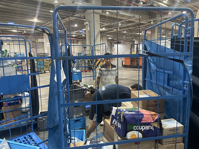 동현씨는 이렇게 반품 물품 정리까지 끝나고 나서야 분류작업을 시작한다. 쿠팡 물류센터(풀필먼트)에서 간선차를 통해 캠프에 도착한 택배물량은 컨베이어 벨트 위로 옮겨진다. 그러면 자동분류시스템인 ‘휠소터’가 배송물품을 영업점별로 분류해주는 데, 이게 끝이 아니다. 쿠팡CLS 에서 고용한 헬퍼(분류인력)가 산더미처럼 쌓인 택배물량을 ‘롤케이지’라고 불리는 대형수레로 영업점 차량이 모여 있는 곳에 옮겨 놓으면 다시 택배기사가 개인 구역에 따라 분류하는 ‘진짜 분류작업’을 진행한다. 구역별로 나눈 물건은 바코드를 찍어 택배차에 싣는 상차까지 완료해야 비로소 분류작업이 모두 완료된다.