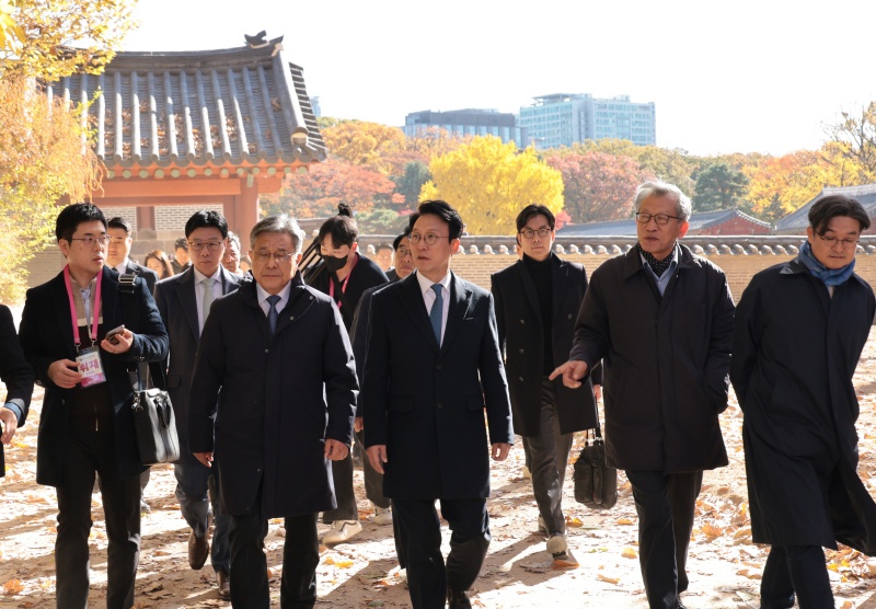 김민석 국무총리가 10일 서울 종로구 유네스코 세계문화유산인 종묘를 찾아 최근 서울시의 세운상가 재개발 계획에 따른 영향을 살펴보고 대책을 점검하고 있다. 이날 종묘 방문에는 허민 국가유산청장, 유홍준 국립박물관장 등이 함께 했다. 2025.11.10. ⓒ뉴시스