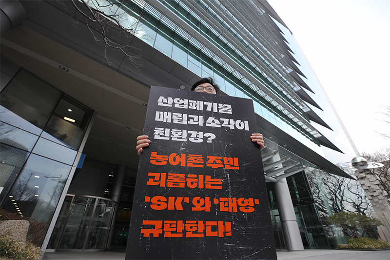 공익법률센터 농본의 하승수 대표가 7일 서울 영등포구 태영건설 사옥 앞에서 태영, SK 등 대기업의 무분별한 산업폐기물 매립장 추진을 규탄하며 1인 시위를 하고 있다. 2024.3.7 ⓒ뉴스1