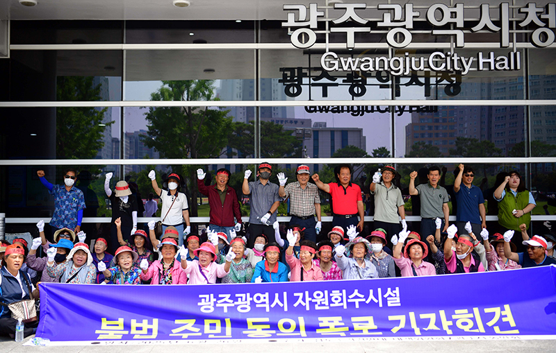삼도소각장반대 대책위원회가 26일 오전 광주 서구 광주시청 앞에서 기자회견을 열어 입지 선정과정에서의 위장전입 의혹을 제기하며 규탄 구호를 외치고 있다. 2025.06.26. ⓒ뉴시스