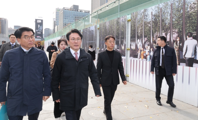 김민석 국무총리가 17일 오전 서울 종로구 광화문 광장에 서울시에서 한국전쟁 참전국을 기리기 위해 조성하는 '감사의 정원' 공사현장 주변을 둘러보고 있다. 서 ⓒ뉴시스