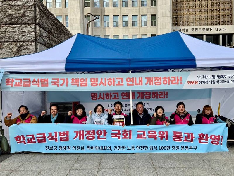 국회 교육위원회에서 학교급식법 개정안이 통과된 9일, 진보당 정혜경 의원과 전국학교비정규직노동조합 등이 국회 농성장에서 개정안 통과를 환영했다. ⓒ학비노조