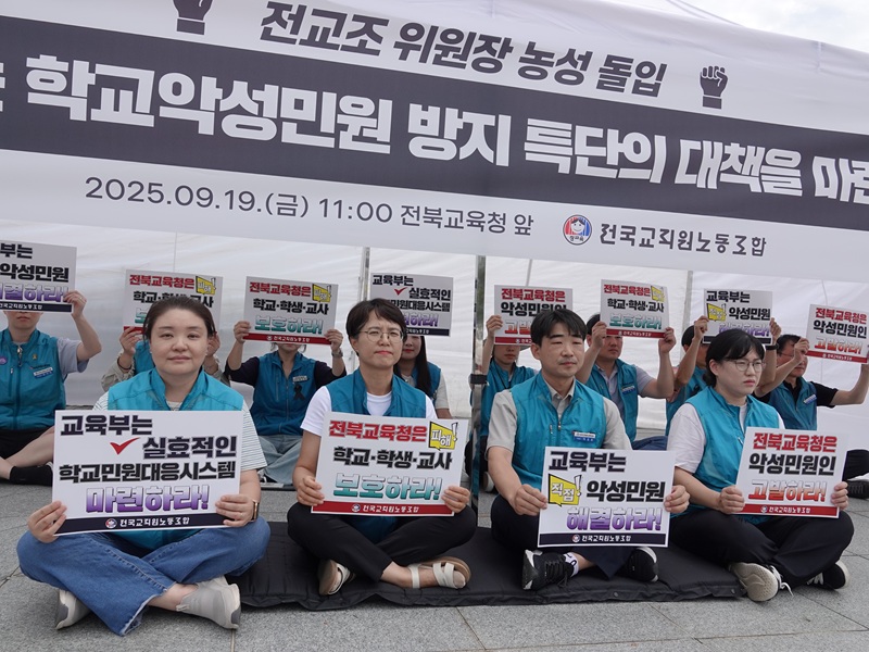 전국교직원노동조합(전교조) 박영환 위원장이 19일 전북교육청 앞에서 악성민원 해결을 촉구하는 농성에 돌입했다. ⓒ전교조