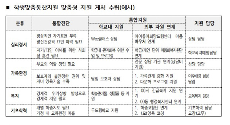 학생맞춤통합지원 매뉴얼에 나온 지원 계획 예시 ⓒ필자 제공