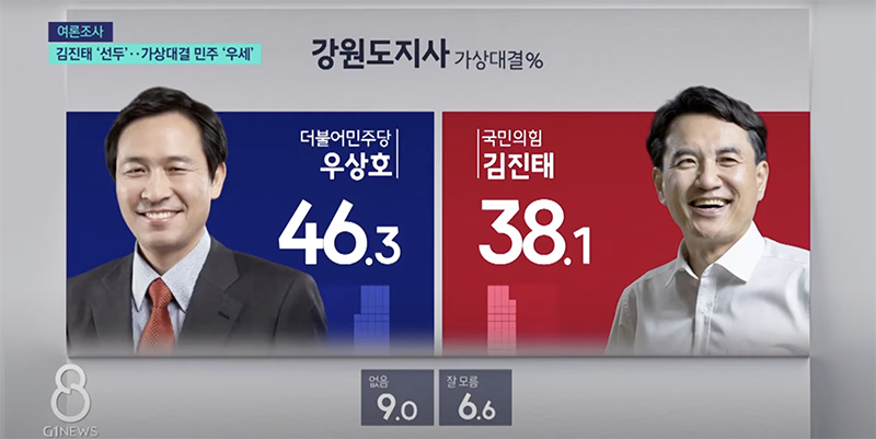 강원도지사 선거 여론조사 결과, 양자대결에서 민주당 후보가 김진태 도지사에 앞섰다. ⓒG1 강원방송