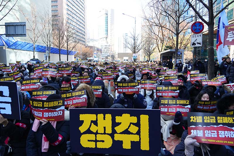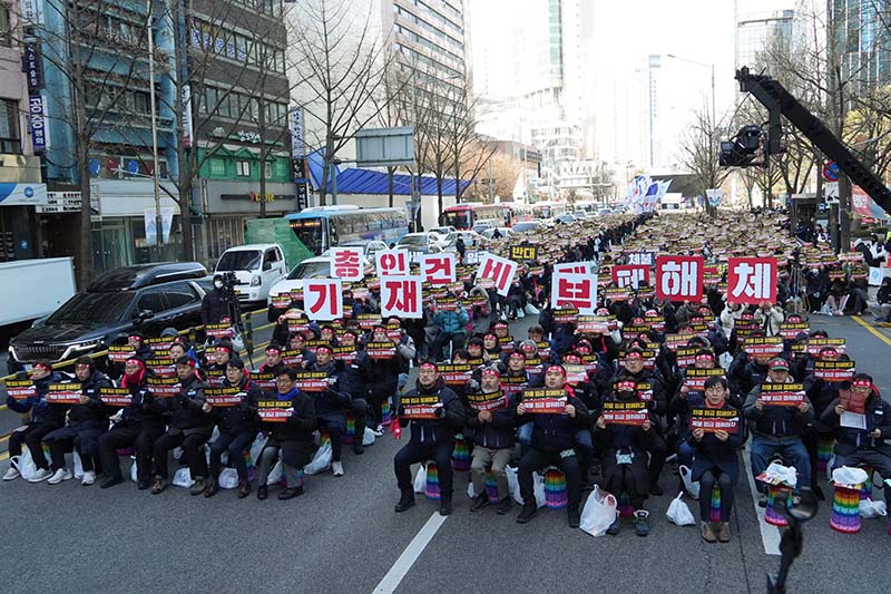김 지부 위원장은 “어느 누구도 사용자가 아닌, 어느 누구도 책임지지 않는, 헌법과 국제노동기구가 명시한 단체교섭권이 철저히 무시된, 말도 안 되는 위헌과 야만에 우리는 방치되고 있다"며 "우리는 돈을 더 달라는 게 아니다. 일한 만큼 보상하라는 외침이고, 동일노동 동일임금의 원칙을 지키라는 호소이며 헌법에 명시된 단체교섭권을 보장하라는 절규”라고 강조했다.